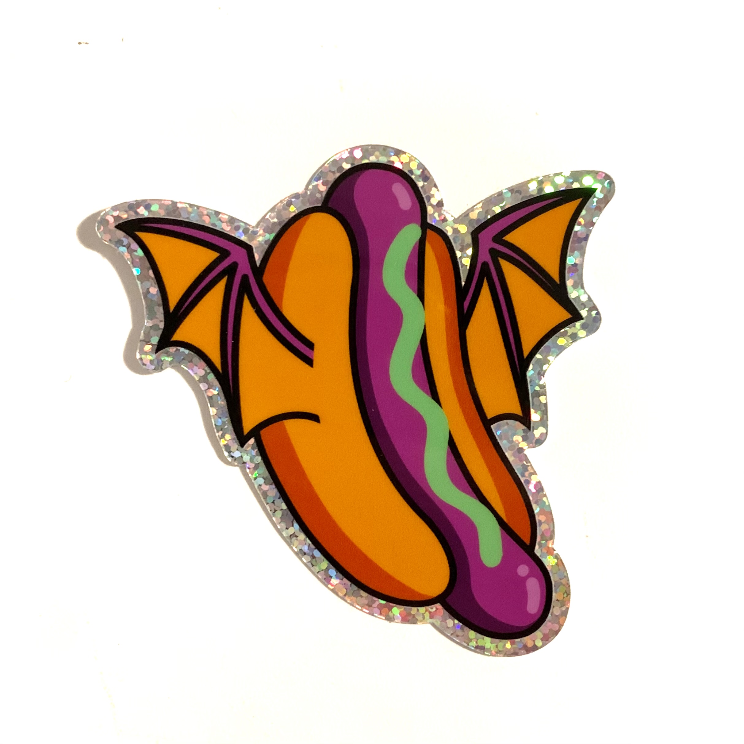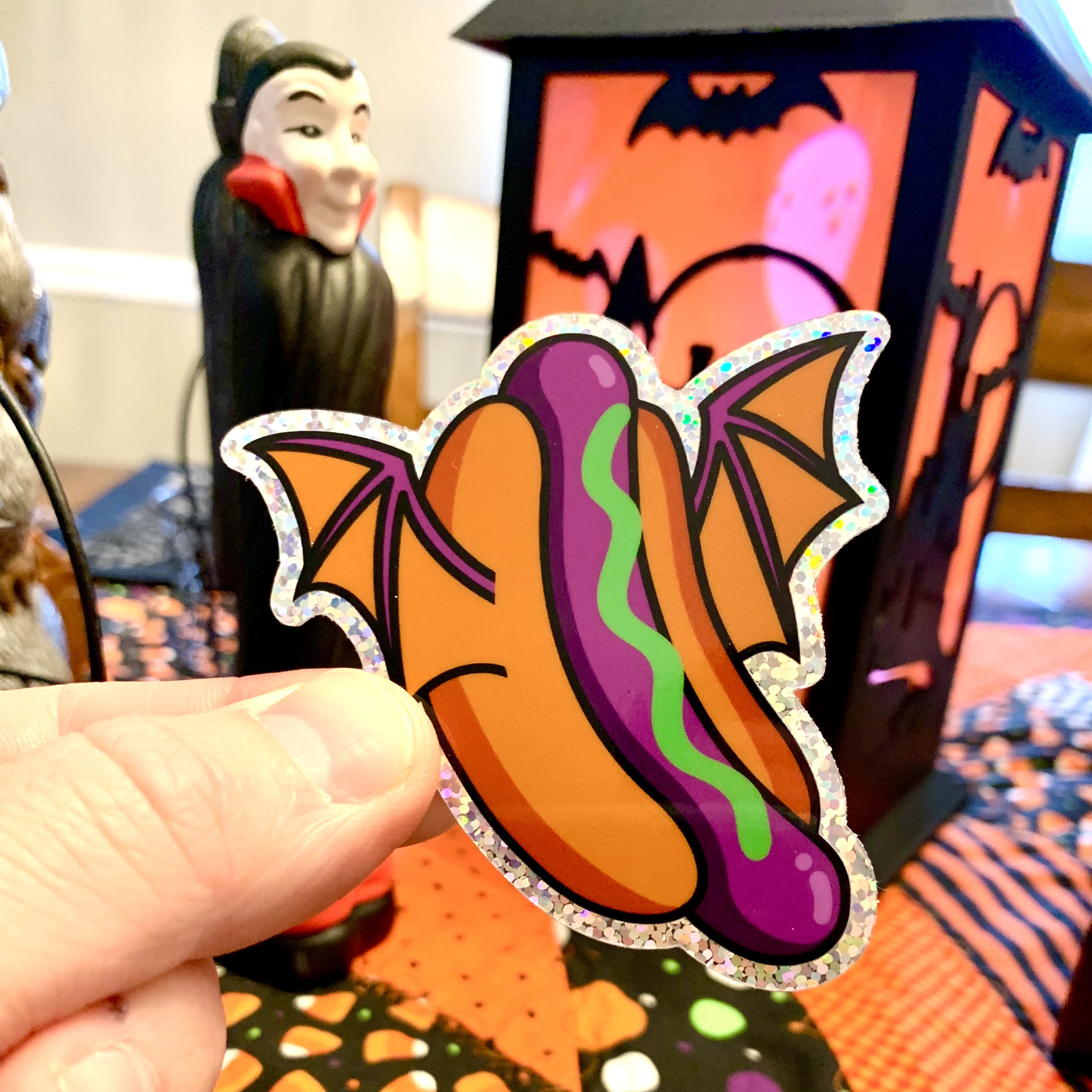 3” tall holographic glitter sticker of Halloween hot dog with bat wings and uhhhh… ectoplasmic mustard.